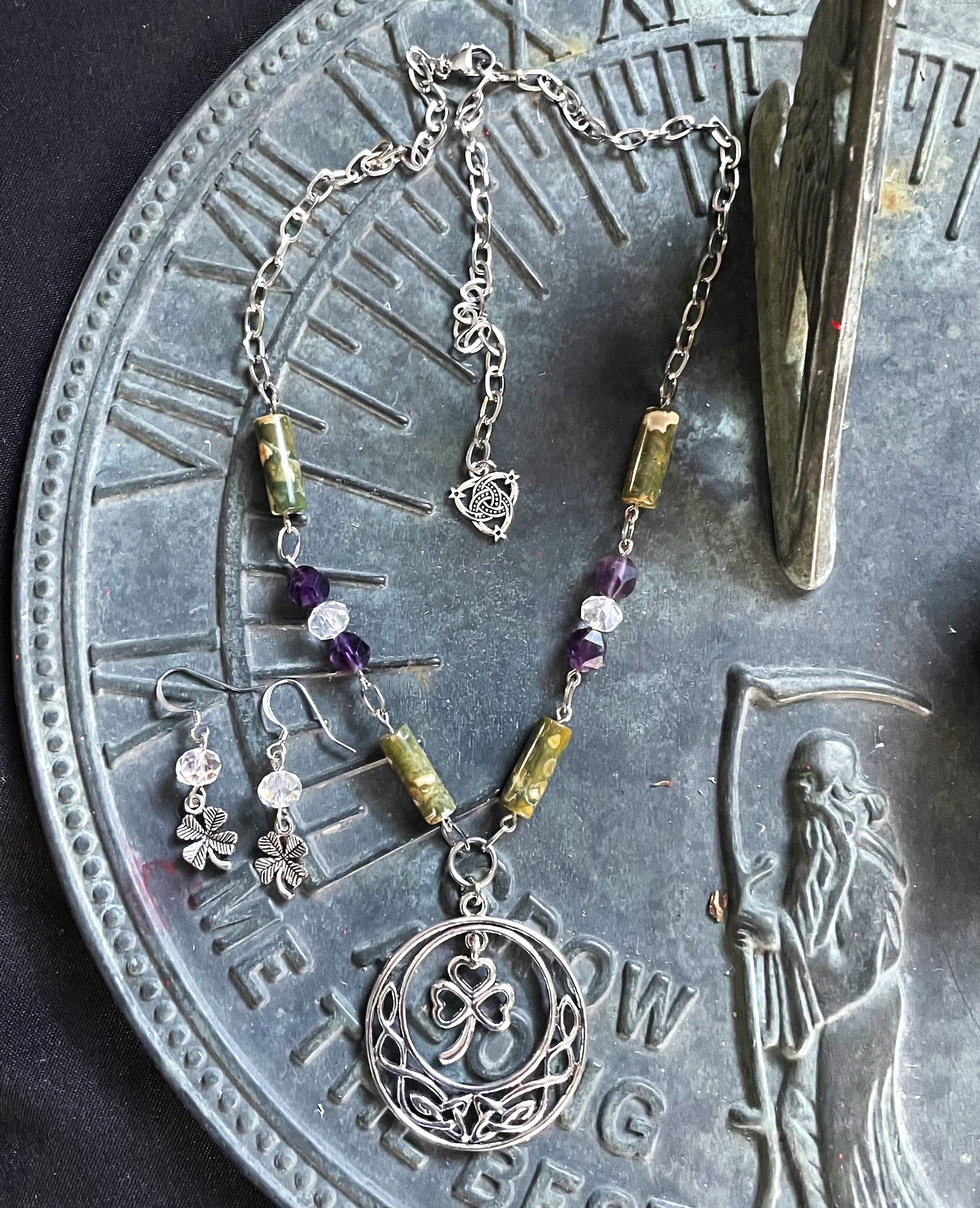 Embrace the magic of ancient artistry with the Crown of the Celts Set, a harmonious blend of spirituality and elegance. This captivating set features the calming purple glow of Amethyst, the earthy, grounding tones of Rain Forest Jasper, and the sparkling brilliance of Czech crystal. Each piece is thoughtfully designed to evoke Celtic heritage, offering a balance of protection, clarity, and strength. Perfect for ceremonies, everyday wear, or adding a touch of mystical charm, this set connects you to nature, intuition, and timeless beauty.