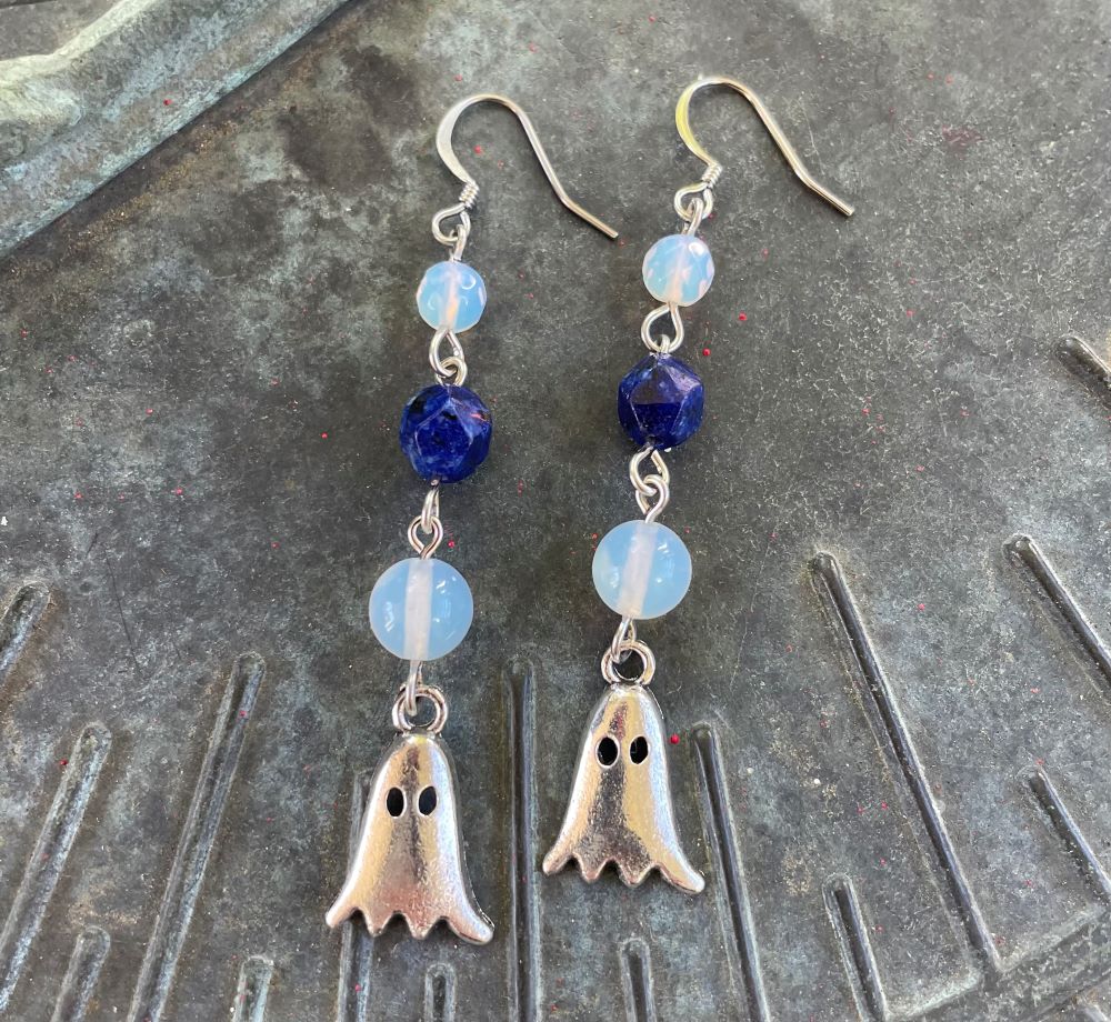 Ghouls Just Wanna Wear Earrings—a playful haunt for your ears! These spectral beauties are conjured with glowing Opalite (to catch the light like a wandering spirit) and deep blue Lapis (for wisdom from beyond the veil). Hung on surgical stainless steel ear wires, they’re lightweight, bewitching, and ready to rattle some chains in style. Perfect for ghouls who know that the afterlife deserves accessories too. 🕸️👻