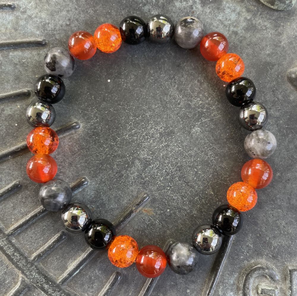 Crafted with a mischievous mix of Carnelian, Crackle Glass, Hematite, Norway Moonstone, and Onyx, this bracelet channels goblin magic and autumn mystery. Perfect for adding a touch of enchantment to your look—just in time for spooky season!