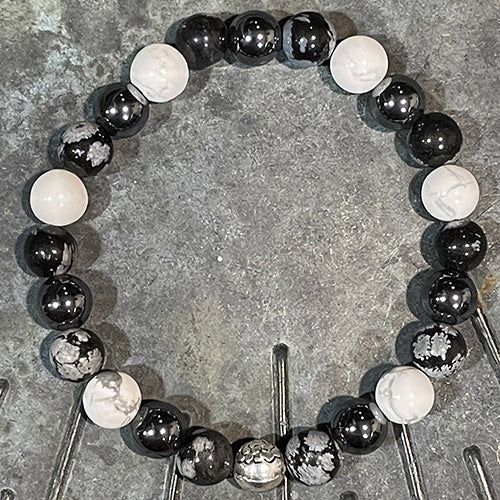 Materials: Howlite, Hematite, Snowflake Obsidian, Pewter Spacer, Stretchy Cord