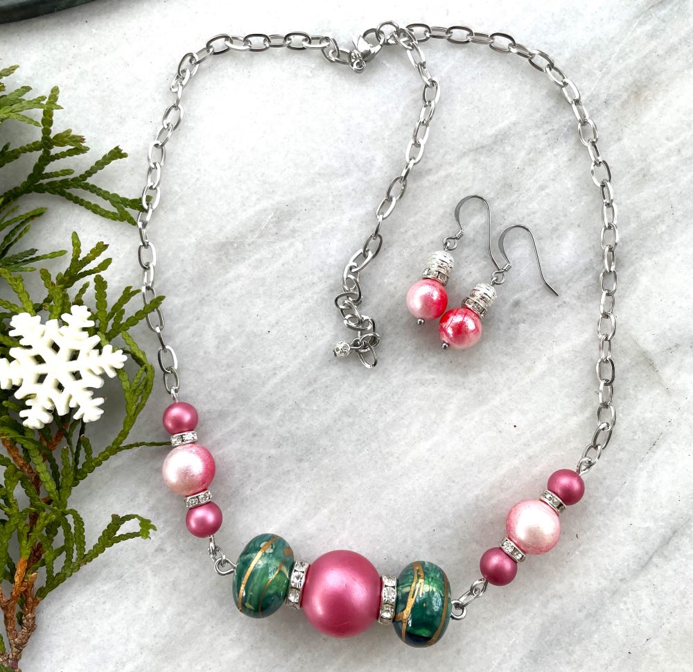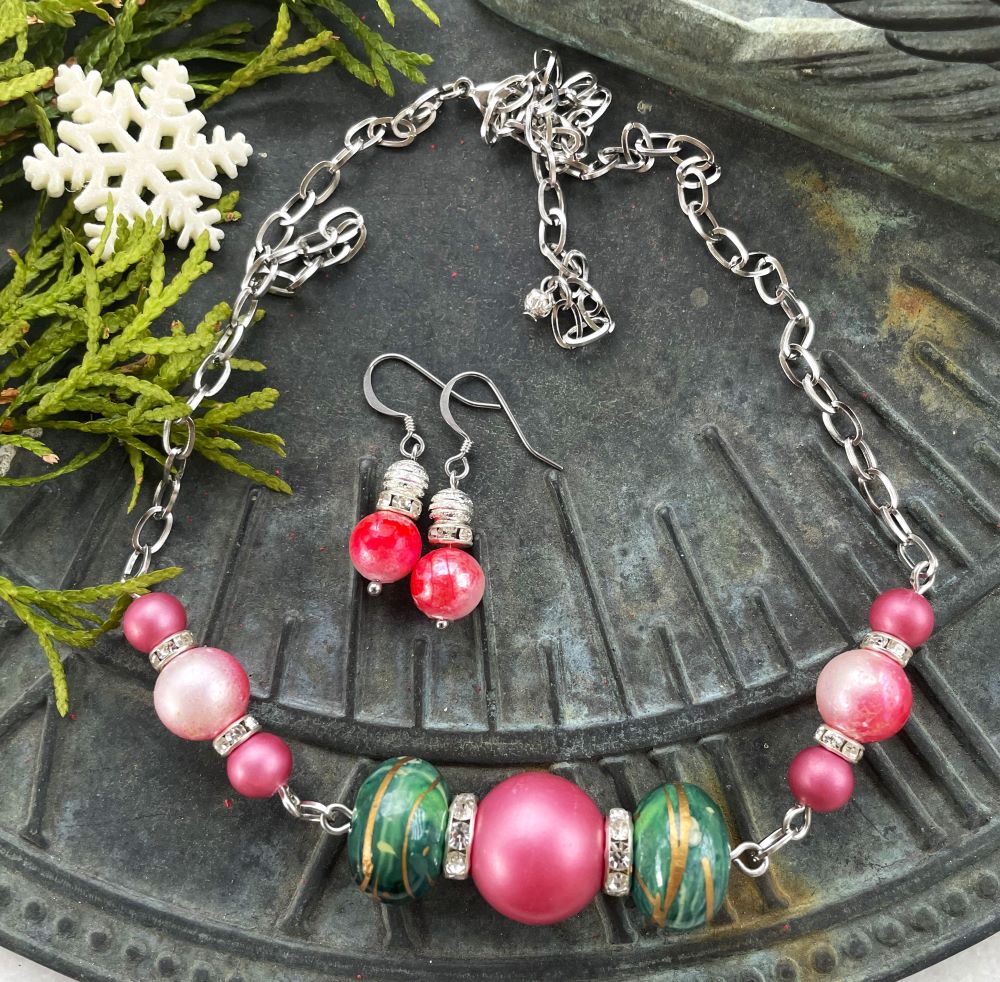 Step into the magic of the season with this charming upcycled jewelry duo crafted from vintage components. The necklace features a playful mix of rosy pink beads, shimmering pearl tones, and deep green marbled accents touched with gold—each separated by twinkling rhinestone spacers that add a festive sparkle. Paired with matching berry-bright drop earrings, this set brings the perfect blend of nostalgia and holiday cheer.