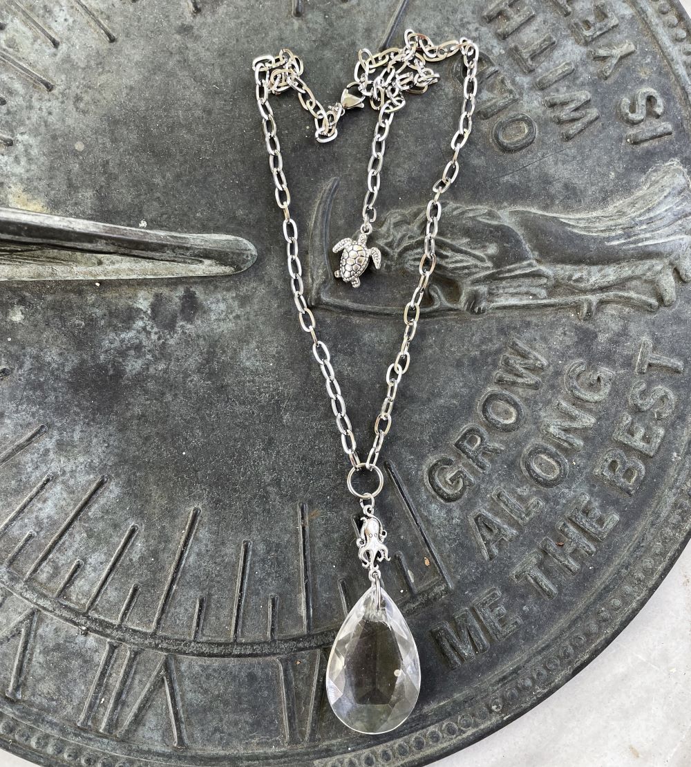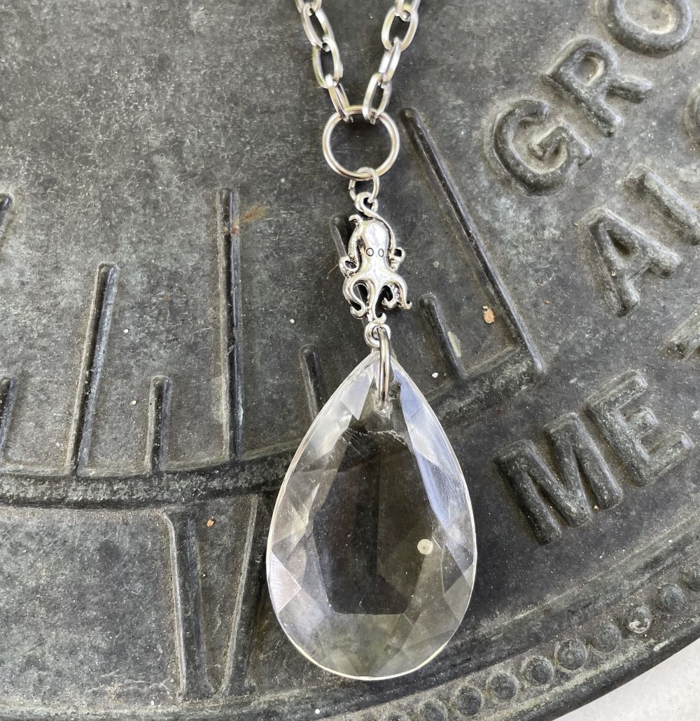 Dive into whimsy with our octopus necklace, featuring a sparkling vintage chandelier crystal at its heart. This playful yet elegant piece blends antique charm with modern artistry, making it a statement accessory that’s as unique as the wearer.