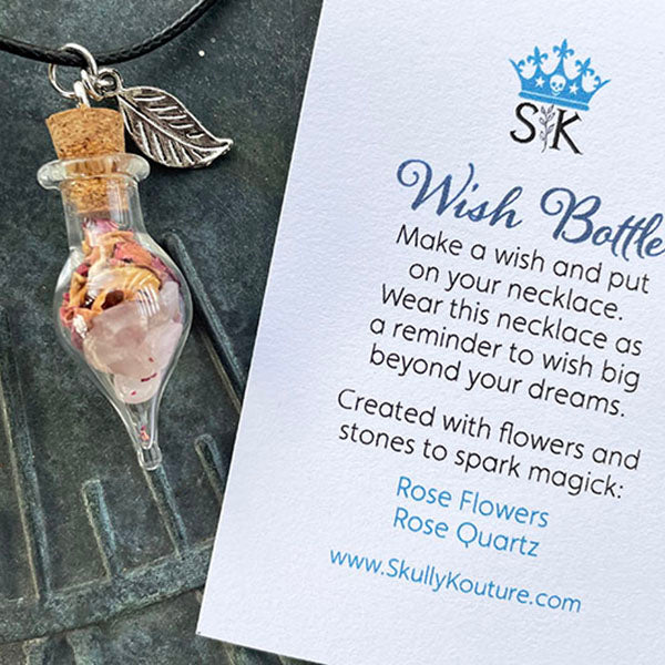Rose Flower and Rose Quartz Wish Bottle Necklace
