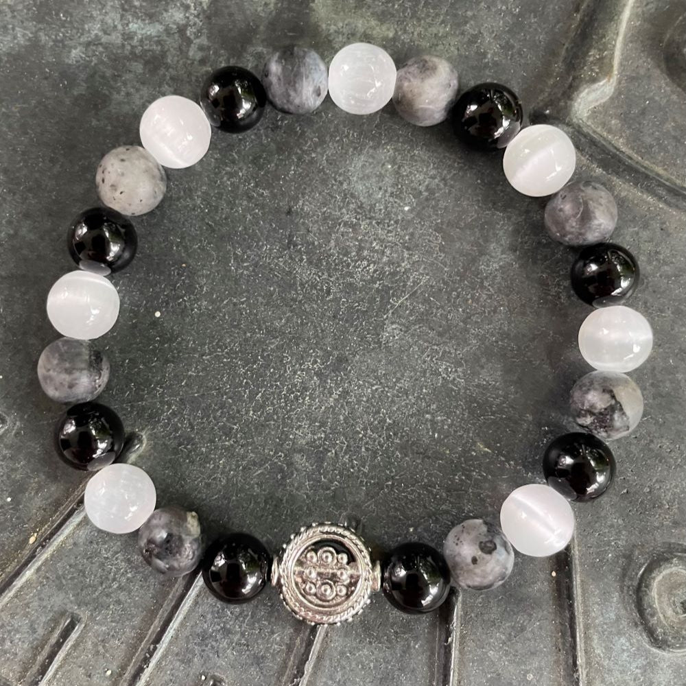 Materials: Labradorite, Onyx. Selenite, Pewter Spacer, Stretchy Cord
